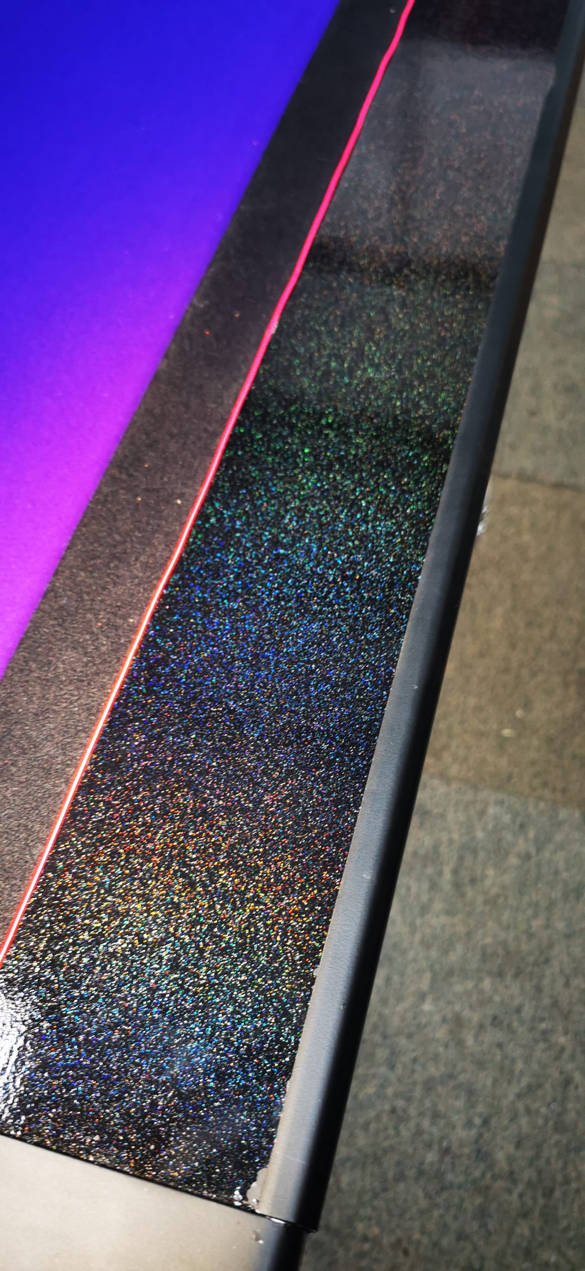 Once the table was fully cured, we completed the rest of the trims and metalwork. We cleaned up and sanded all the table trims, ready for repainting. We then painted the trim a matt black to offset all the bright and glossy colours of the table.