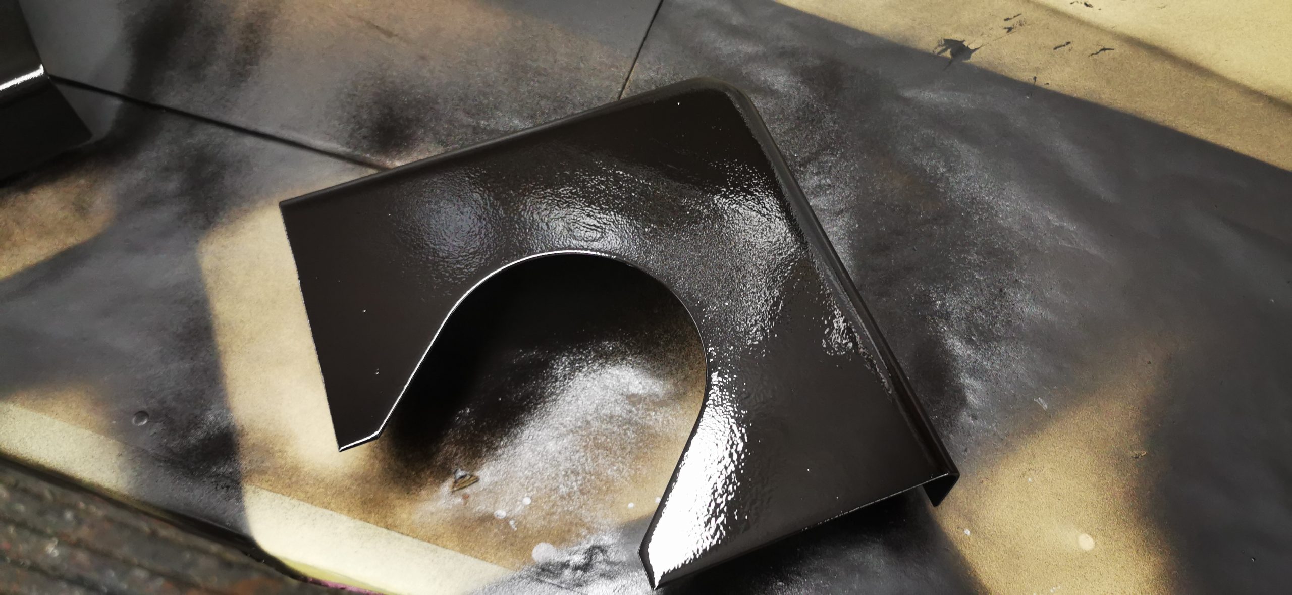 Next, it was time for paintwork. All components were taken off the table before it was sprayed in a RAL 9005 deep black acrylic gloss paint; this was applied straight over the 2K filler primer. Three coats were used, allowing 40 minutes of drying time between each.