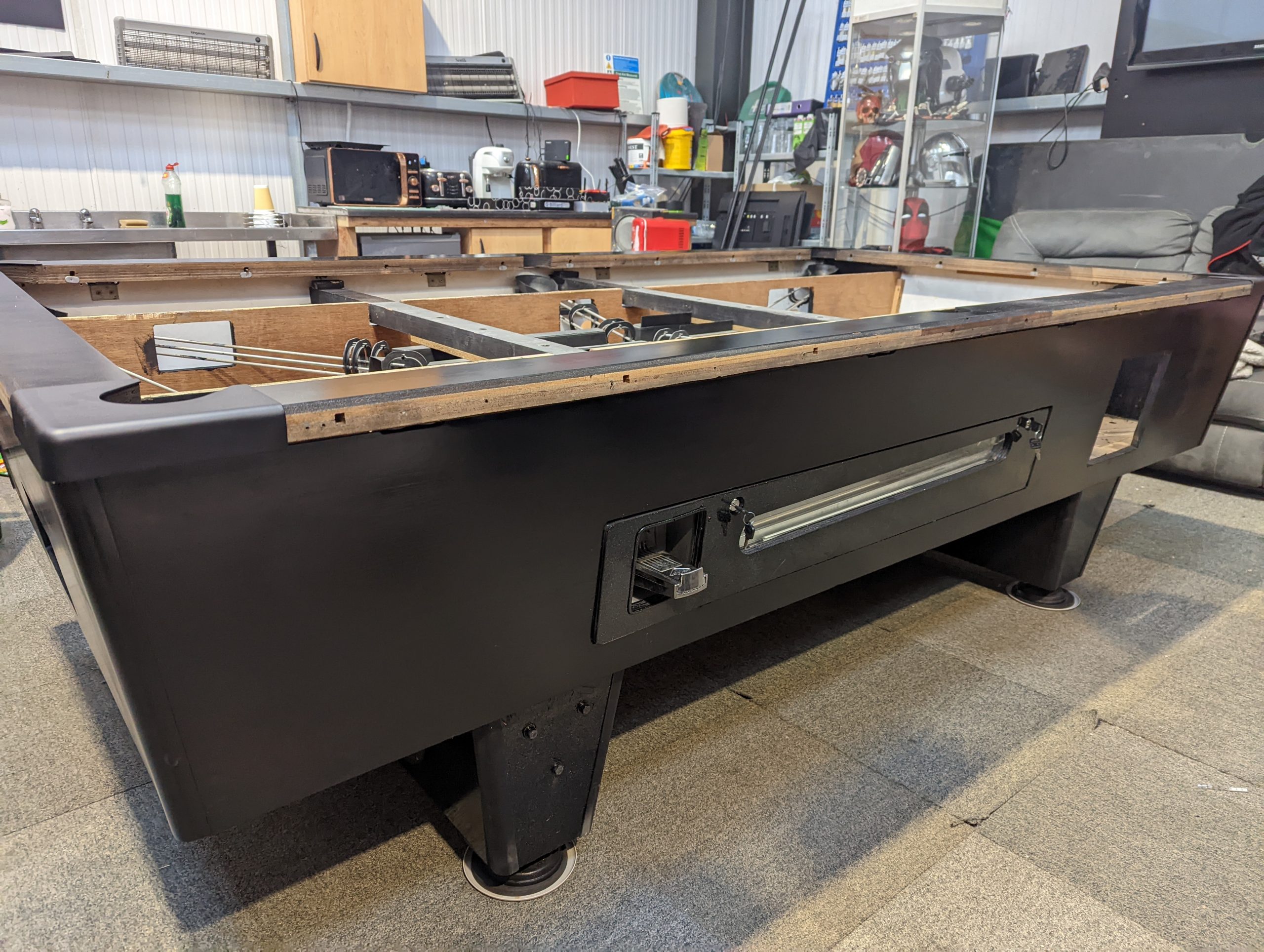 The sheer size of the table meant that it was incredibly cavernous inside, opening up a wealth of options when it came to fitting a power supply. In the end, we mocked up an anti-surge power extension through the coin release into the main table. This meant we had a safe power supply, allowing endless possibilities of features that could be added. Next, we stripped the table of all external gubbins and trims to see just how much work we had to do.